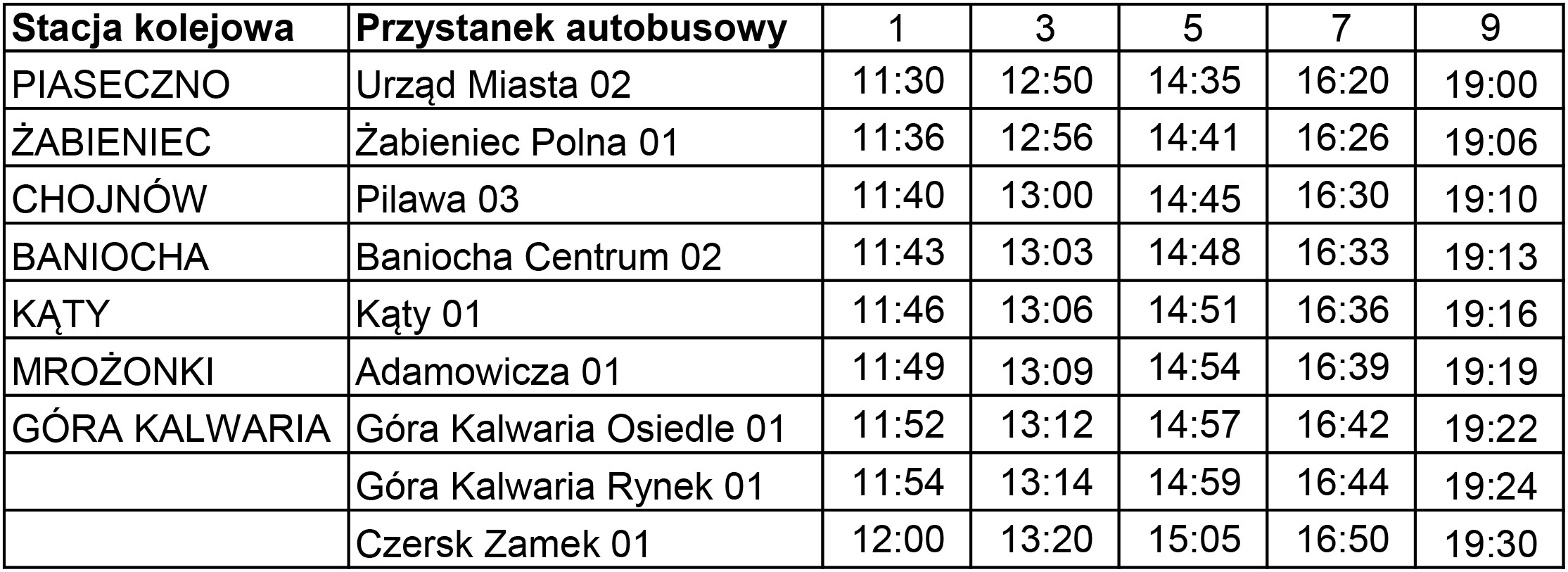Odjazdy z Piaseczna (Piaseczno Urząd Miasta 02): 11:30, 12:50, 14:35, 16:20, 19:00